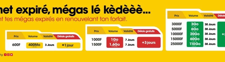 – Forfaits internet de 3000F ; 5000F, 10000F et 25000F délai gratuit accordé 5 jours.
