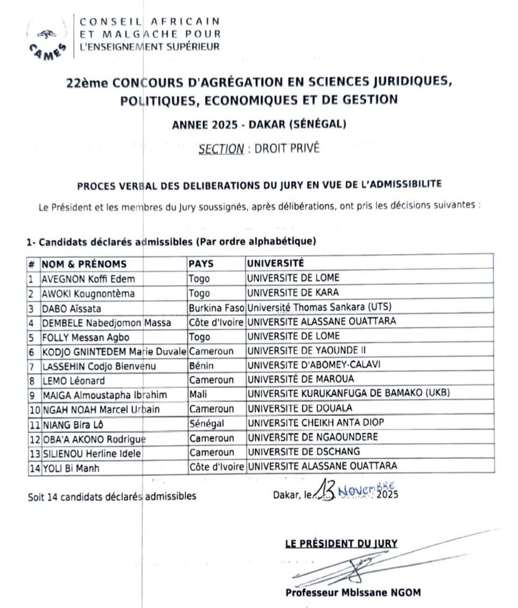 Les épreuves en présentiel de la 22ᵉ session du Concours d’Agrégation en Sciences juridiques, politiques, économiques et de gestion (SJPEG) du CAMES se tiennent du 10 au 21 novembre 2025 à l’Université Cheikh Anta Diop (UCAD) de Dakar.