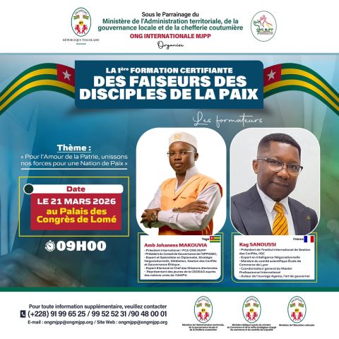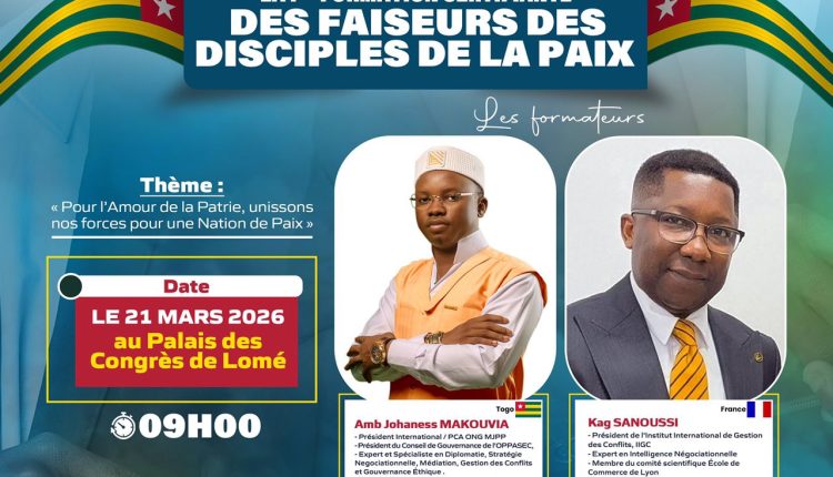Dans un contexte mondial marqué par des défis sécuritaires, sociaux et identitaires croissants, le Togo s’inscrit résolument dans une dynamique proactive de consolidation de la paix et de promotion du vivre-ensemble. C’est dans cette vision que s’inscrit le lancement du programme GÉNÉRATION PAIX « École de la Paix et de la Campagne nationale des Disciples de la Paix », prévu le 21 mars 2026 au Palais des Congrès de Lomé.